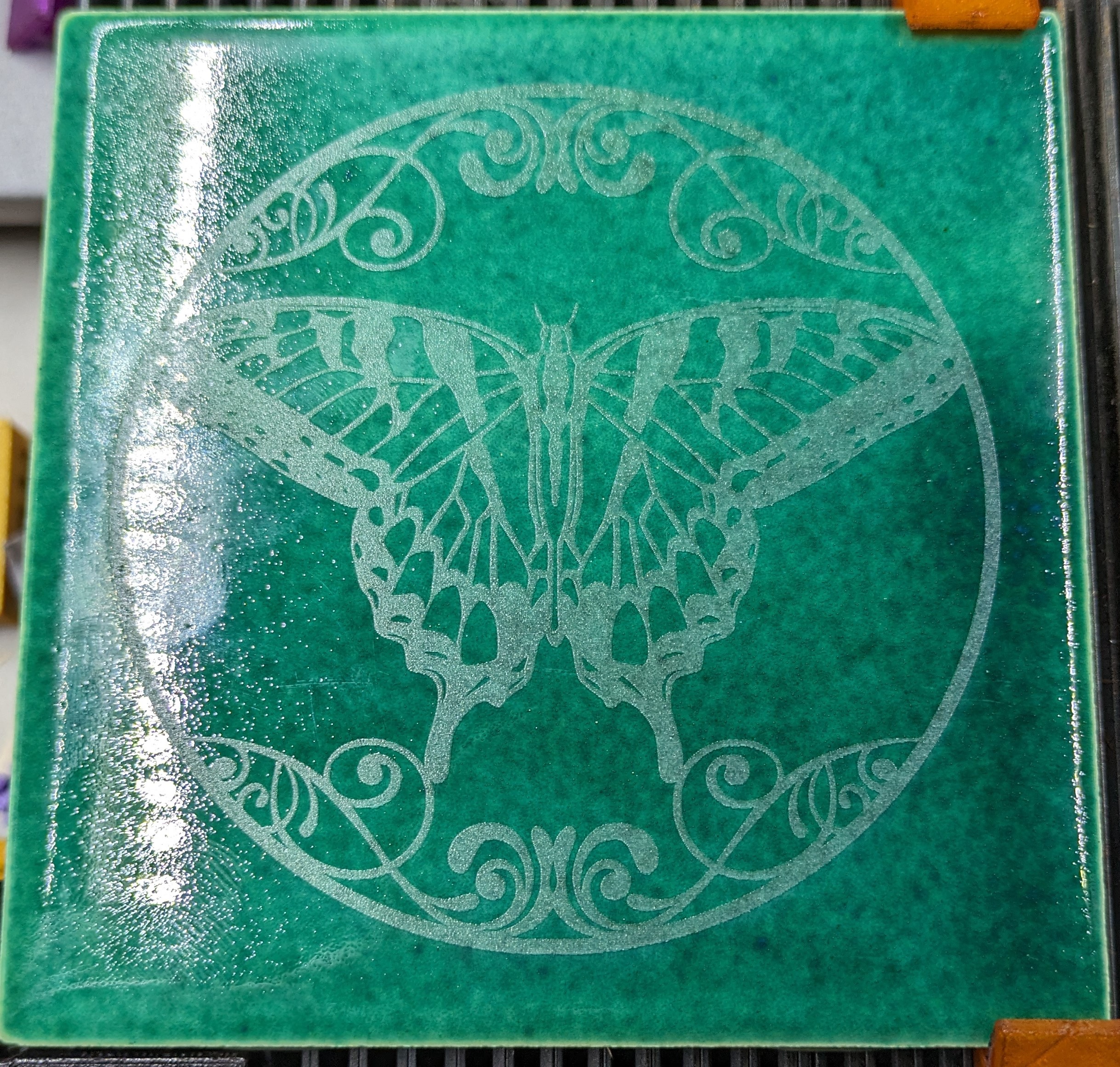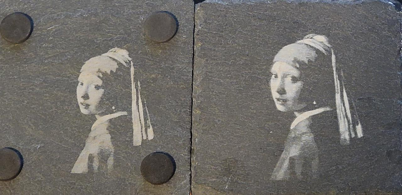 The image engraving on black slate tiles (above) shows that the 2W IR laser can attain a fine gradation of different grey levels on the slate, unlike the 40W laser which seems to have a very binary effect on the slate of either not affecting it or being a uniform white color independent of laser power. The fine gradation of the IR laser allows much higher quality images to be generated on the slate.