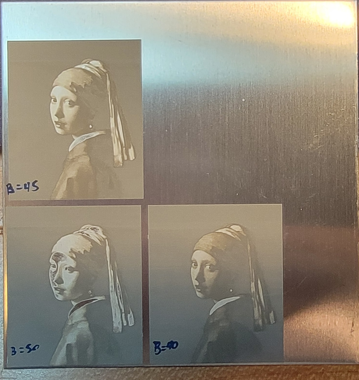 The greyscale images on aluminum can only be attained using the 2W IR laser, as the 40W laser has very little effect on aluminum. As with the case of black slate, a nice gradation of grey levels can be obtained on the aluminum, resulting in high quality images.