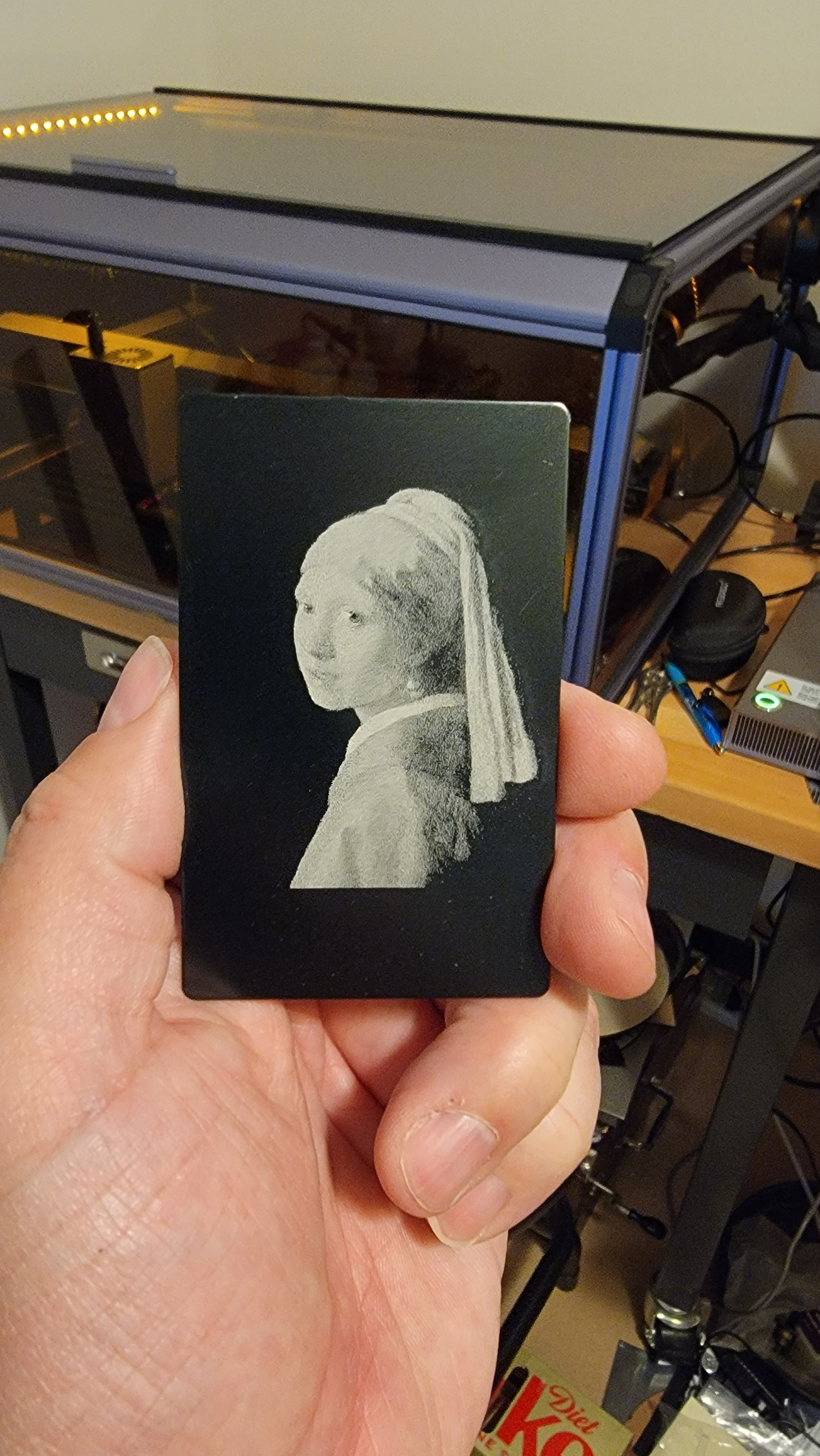 The image was generated by dot-filled engraving on black-anodized aluminum, using an inverted image (negative) that has the brightest regions of the image corresponding to the highest laser powers.