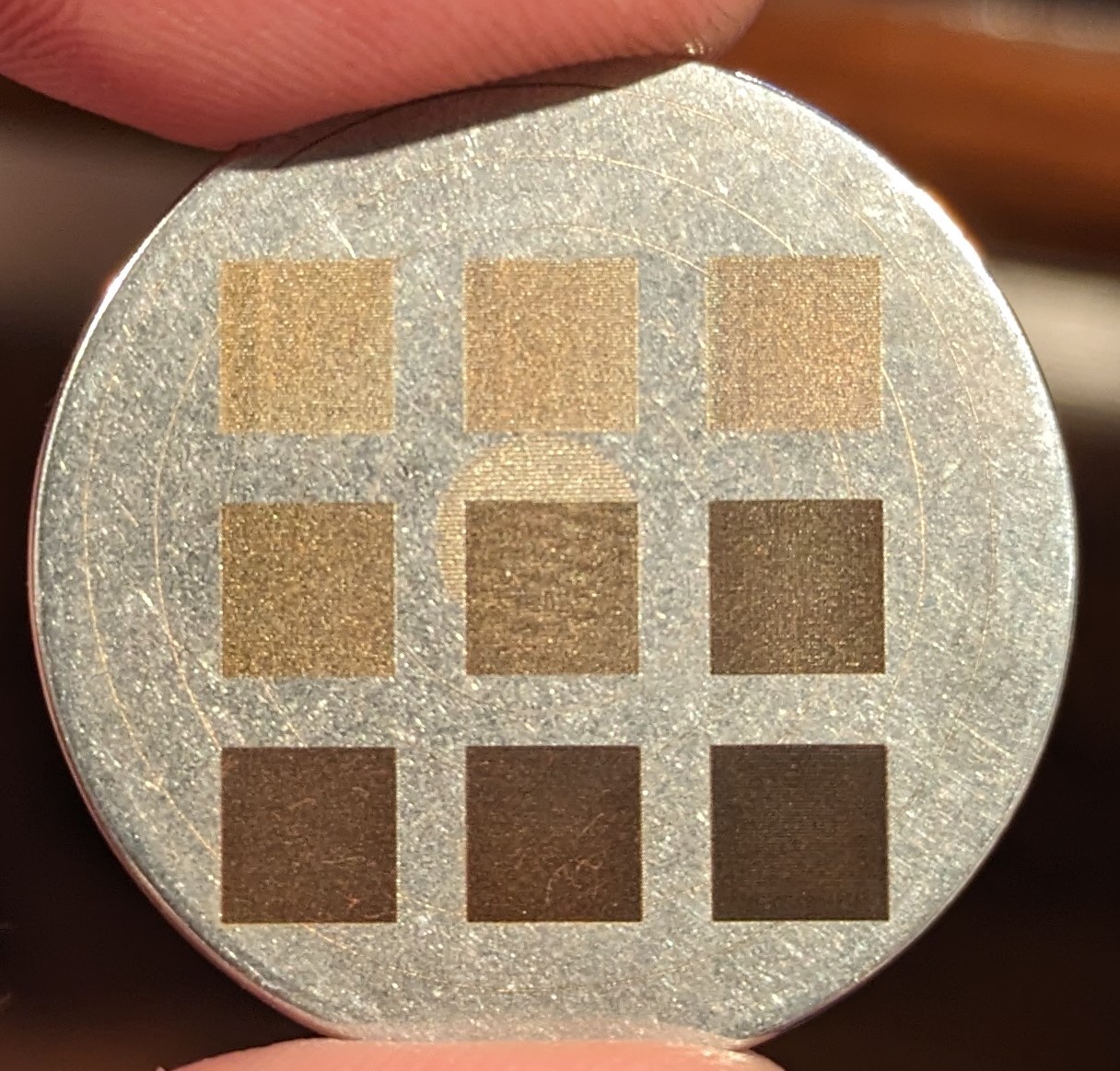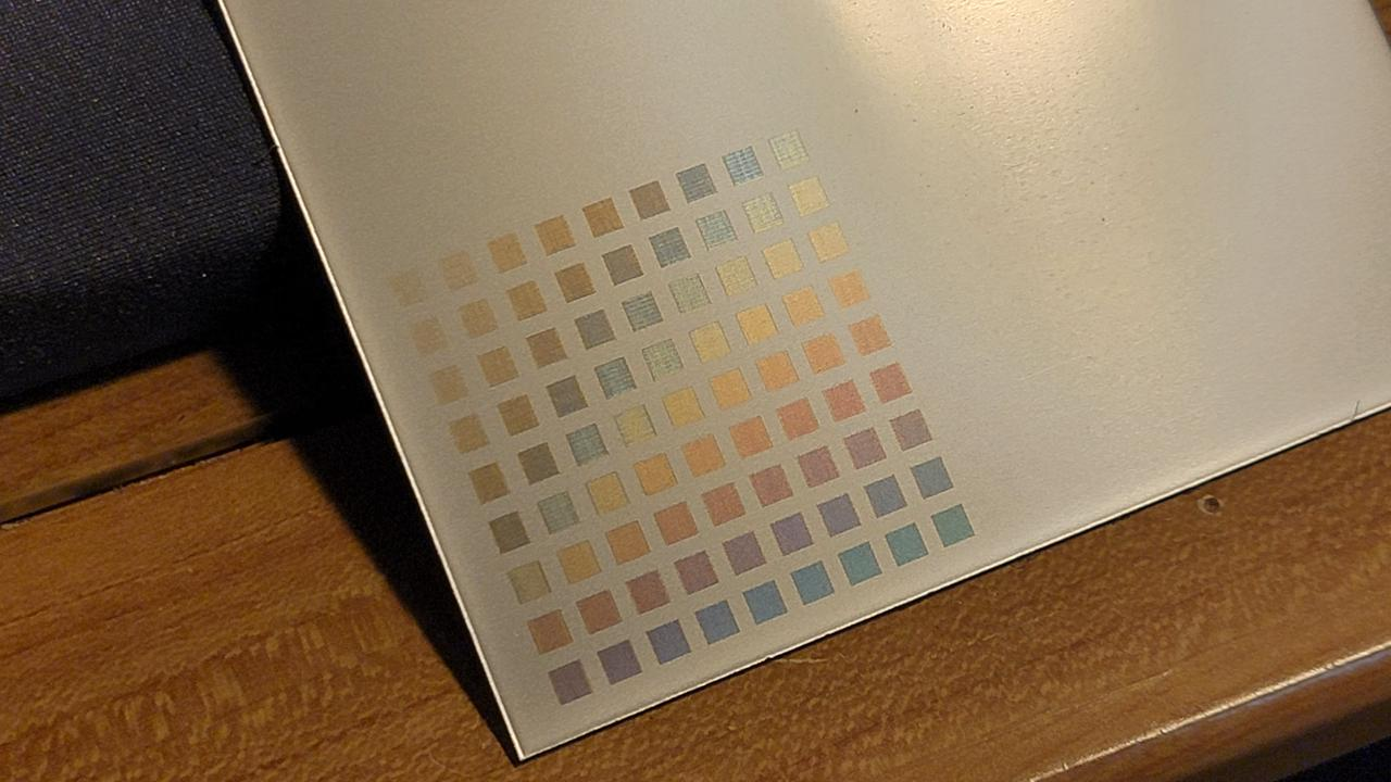 I made many attempts to generate laser color on stainless steel, titanium, tantalum, and niobium sheets using the 2W IR laser. The image above is the best result I obtained. It is on stainless 304. The color seen is very strongly dependent on the viewing angle, and mostly just looks brown when viewed from straight on. I'm not sure why the 40W laser is able to produce better colors on this same steel, but part of the reason may be due to the small spot size of the IR laser in comparison to the 40W. My color experiments suggest that the degree of beam overlap between adjacent raster lines has a strong effect on generated color, which makes sense since the thickness of the metal oxide optical interference layer depends strongly on the integrated amount of laser power that any given area sees. A much tighter beam spot size requires much more closely spaced lines to get appreciable beam overlap, and the 30micron IR spot thus requires line interval spacings around 30microns or less. This is approaching the smallest interval spacings the laser gantry can move, so there isn't much room to maneuver when trying for different colors. Additionally these small spacings result in VERY long times being needed to fill an area when compared to the 40W laser. My conclusion at this point is that the 2W IR laser module is not practical for full color laser marking on stainless steel.