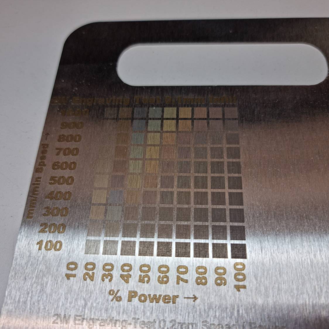 Testing Plan: Vector engraving in different strengths for comparison between 2W IR and 40W (half diode).